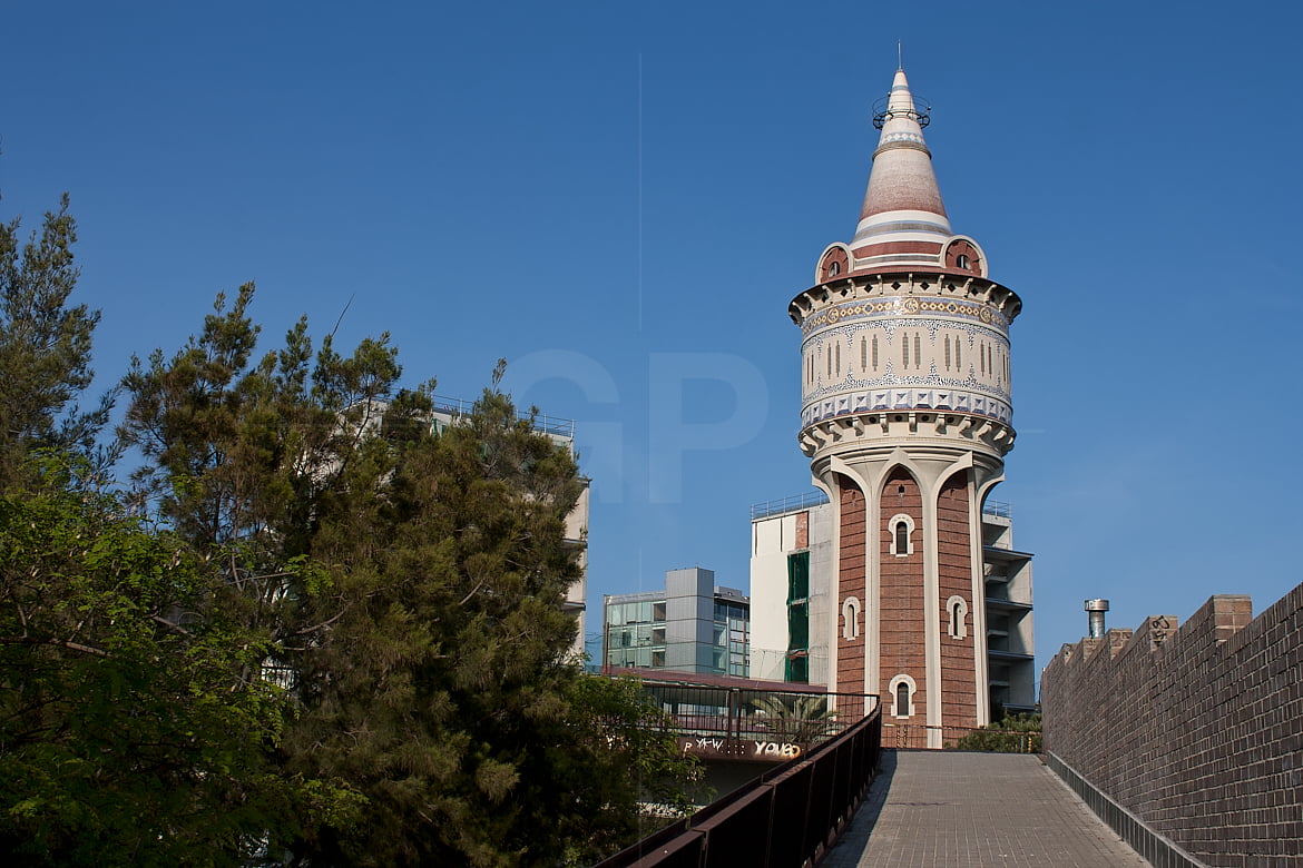 La Catalana de Gas water tower horizontal view photograph in Barcelona’s Port Olímpic area, bulding designed by Josep Domènech i Estapà in 1908, architect who distinct both from Eclecticism and Modernisme, but was accepted by the establishment.