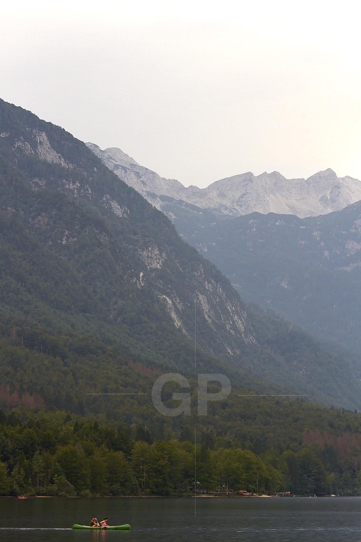 A couple rowing a Kayak inside Bohinj lake ear the Triglav National Park.