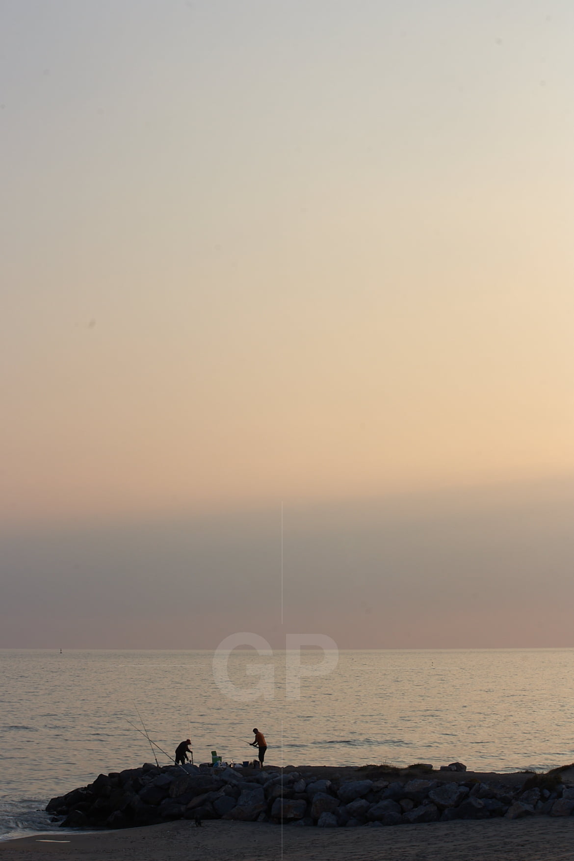 A couple of fishers having fun in sunset at El Prat de Llobregat, very close to the Barcelona’s international airport at sunset.