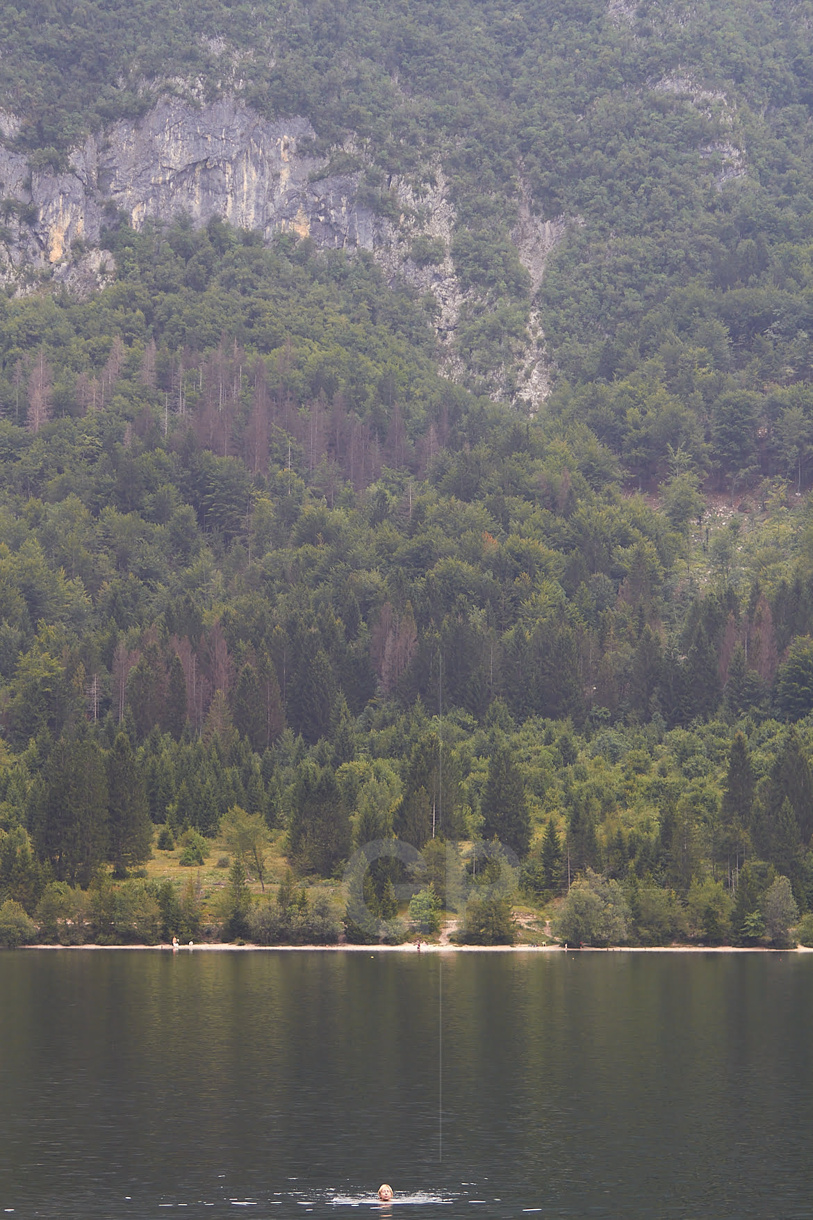 A girl swimming inside lake Bohinj in Slovenia at Triglav National Park and Julian Alps before the rain.