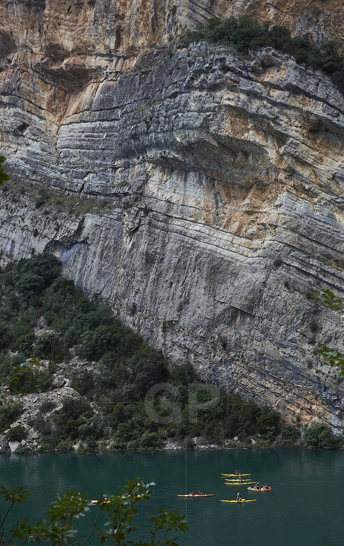 Photograph showing a group of kayaks sailing and having fun inside the river Noguera Ribagorçana, ad MontRebey gorge at summer.