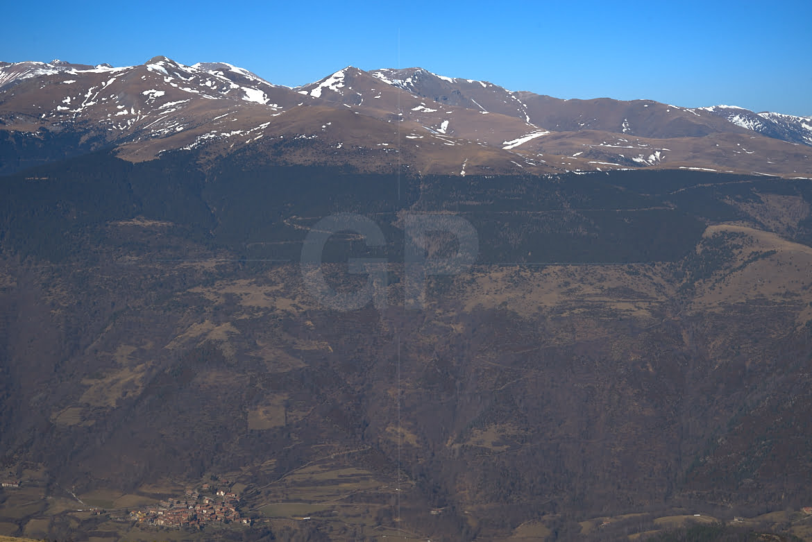 Photograph with a landscape where you can view Pardines village from mountain Serra Cavallera near the Taga mountain and some peaks in it.