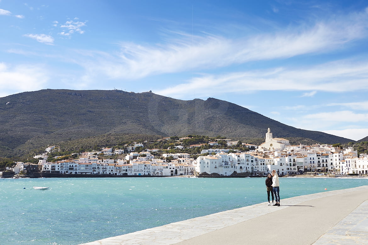 A selfie with Cadaqués as background is a picture where a young couple are making a selfie with their mobile.