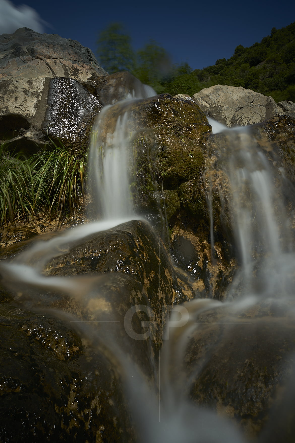 Photograph where Siurana river appears descending some rocks in vertical format and aspect ratio 3:4.